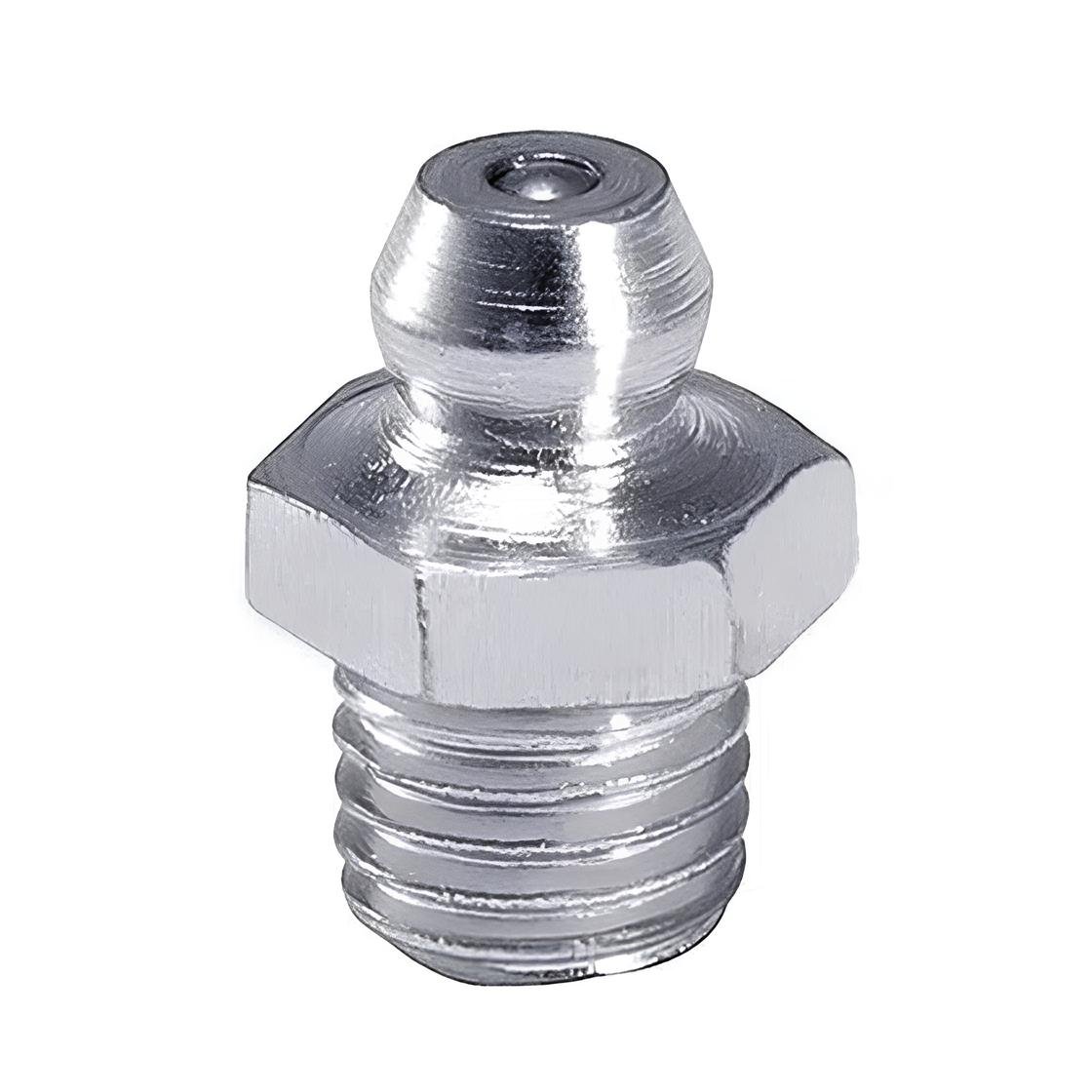 Dispositivo de lubrificação em linha reta, fabricado em aço com acabamento zincado branco, projetado para aplicação de graxa sob pressão em pontos de fácil acesso de máquinas, veículos e equipamentos industriais.