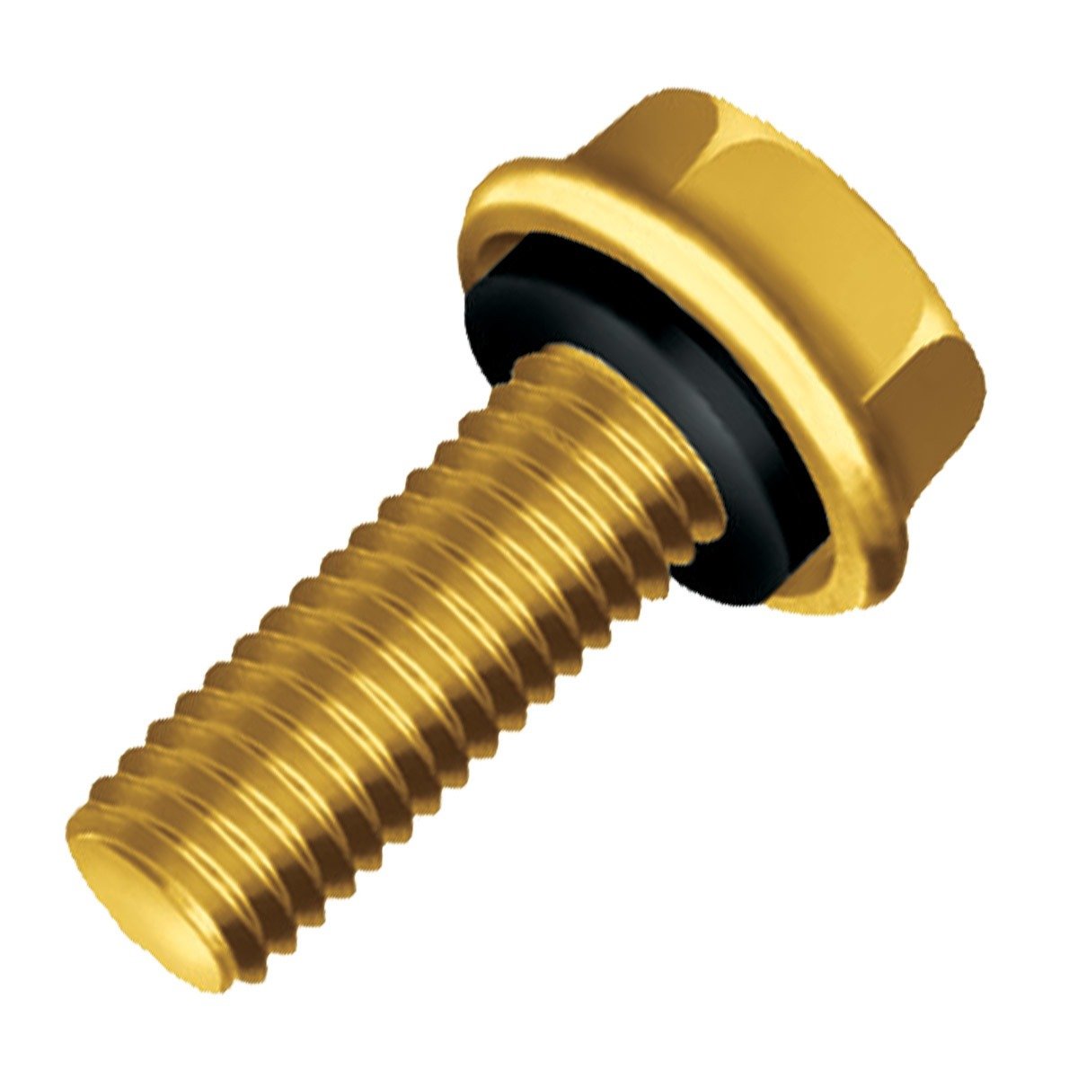 Parafuso com cabeça sextavada flangeada integrada e arruela de vedação, fabricado em aço com acabamento bicromatizado. Proporciona fixação firme e vedação contra infiltração de líquidos ou poeira, dispensando o uso de arruela separada.