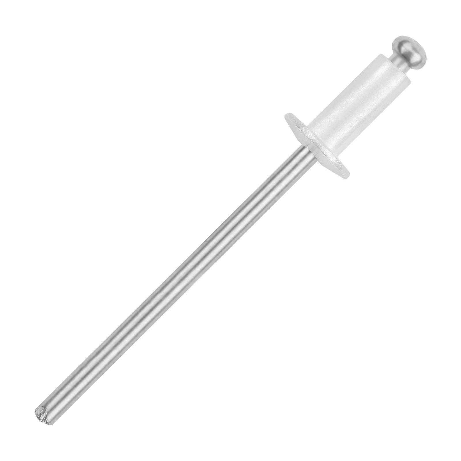 Rebite de repuxo com corpo em alumínio e acabamento branco, desenvolvido para criar uniões permanentes, rápidas e com um acabamento limpo e discreto. O mandril em aço proporciona a resistência necessária para um repuxo seguro e consistente.